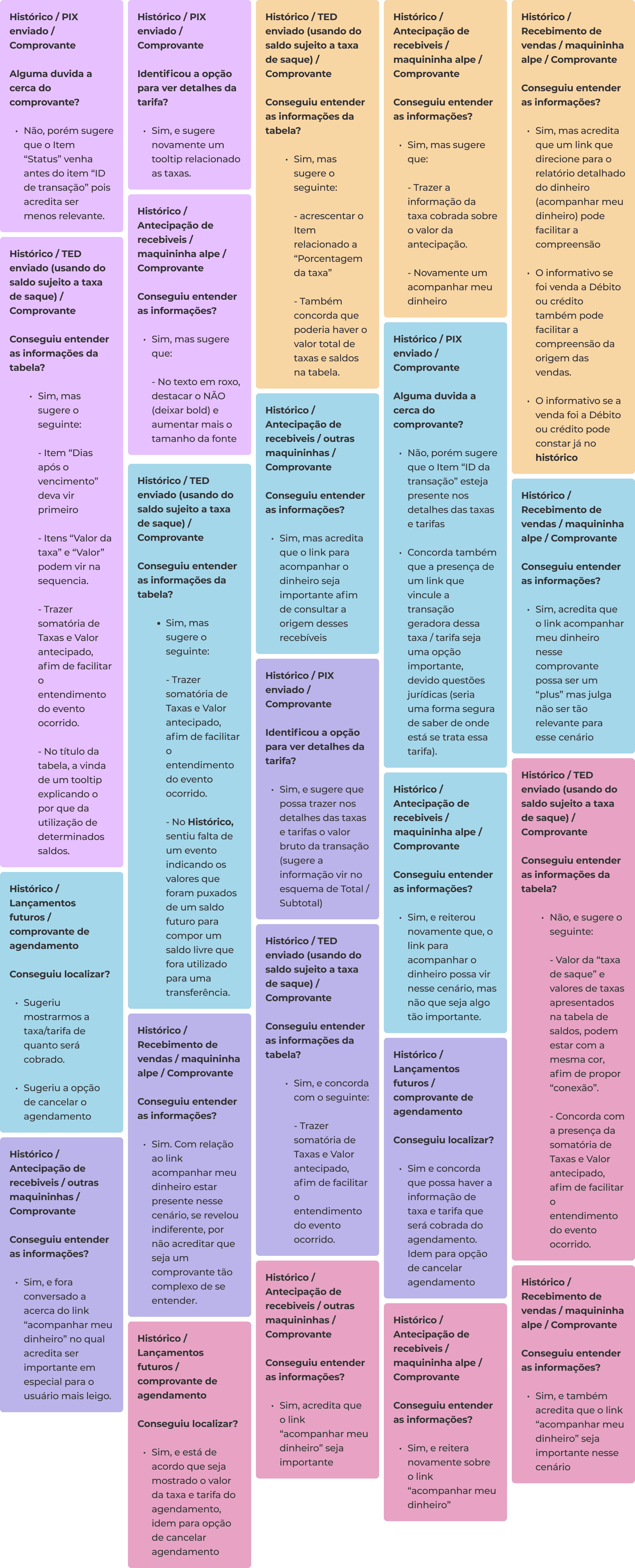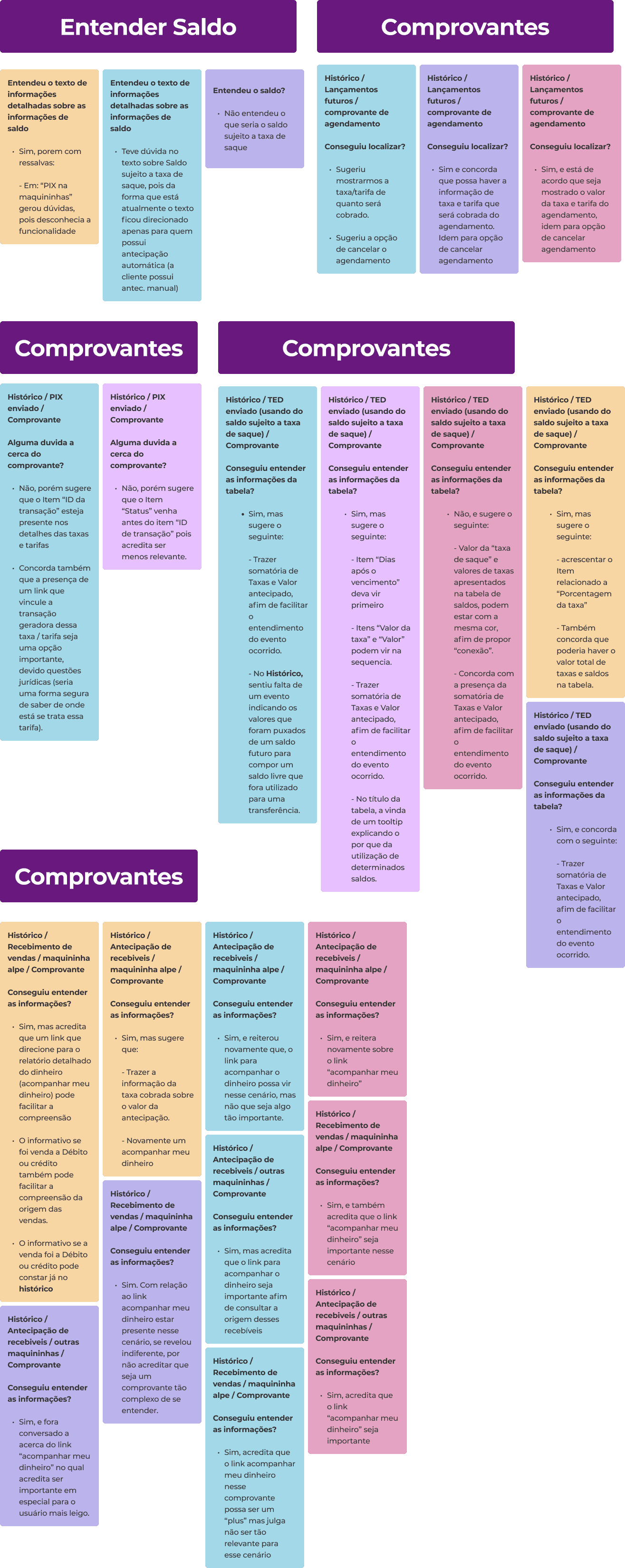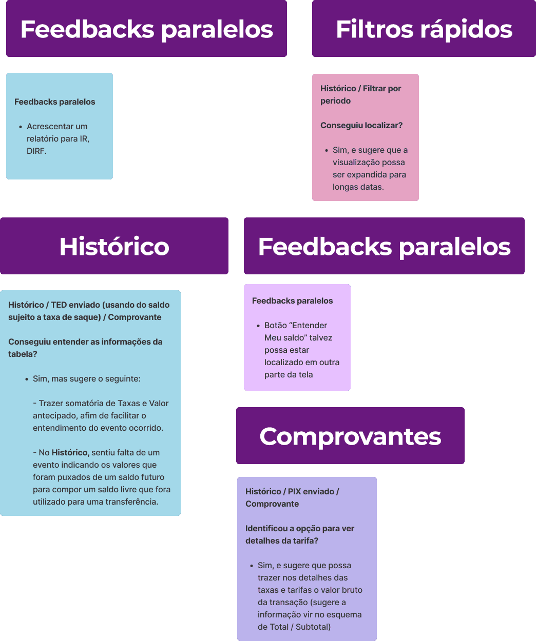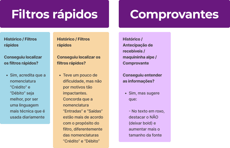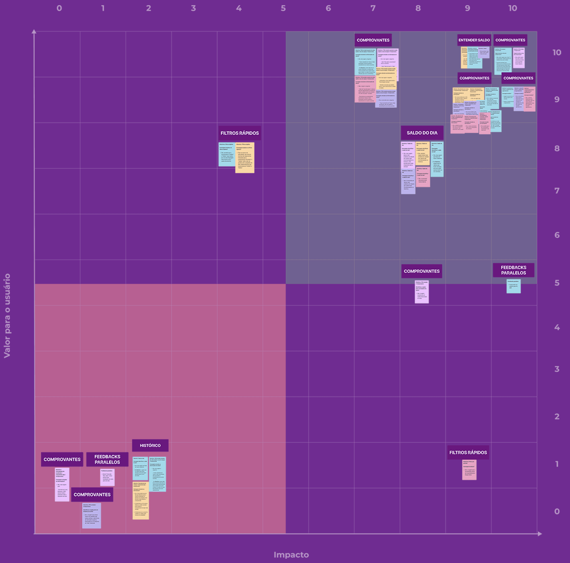 Após a utilização dessa técnica, ficou mais visível quais serão os itens que devem ter maior prioridade. Considerando que alguns ajustes dentro do grupo “Comprovantes” teriam baixo valor ou impacto para os usuários, realizei o desagrupamento de certos cards, porém mantendo-os com a tag “Comprovantes” para não perder a relação ao qual pertencem.
