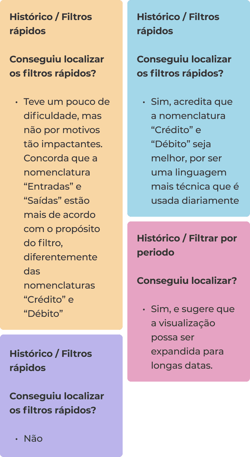 • Teve um pouco de dificuldade, mas não por motivos tão impactantes. Concorda que a nomenclatura “Entradas” e “Saídas” estão mais de acordo com o propósito do filtro, diferentemente das nomenclaturas “Crédito” e “Débito”.