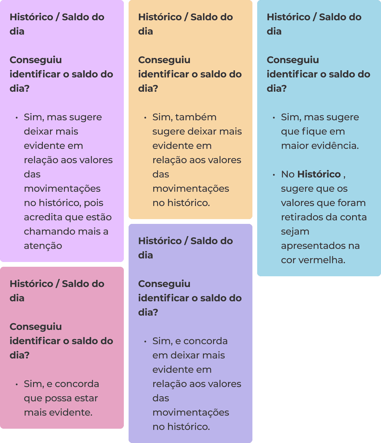 Após a realização dos testes, era necessário ter uma visão geral sobre o que ficou claro, o que gerou certas dúvidas, e o que não ficou claro acerca da tela de saldo e extrato. Para isso, utilizei a técnica “Matriz de Suposições”, no qual foi mapeado cada etapa percorrida no teste de usabilidade, e se cada etapa foi bem sucedida (ou não) por cada participante.