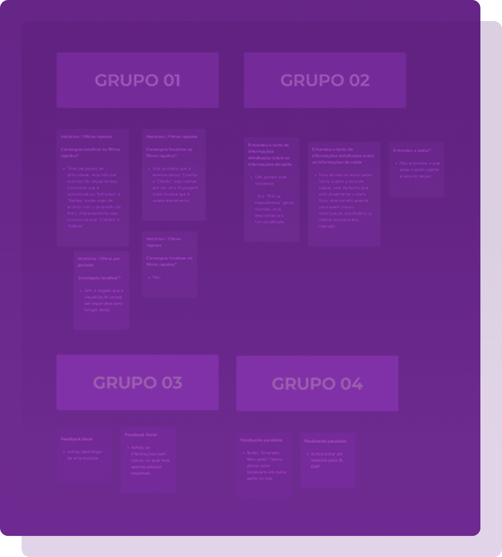 Após a utilização do Affinity Map, ficou mais evidente que dentre todos os grupos, o que teve mais pontos de observações por parte dos participantes foi o grupo sobre comprovantes.