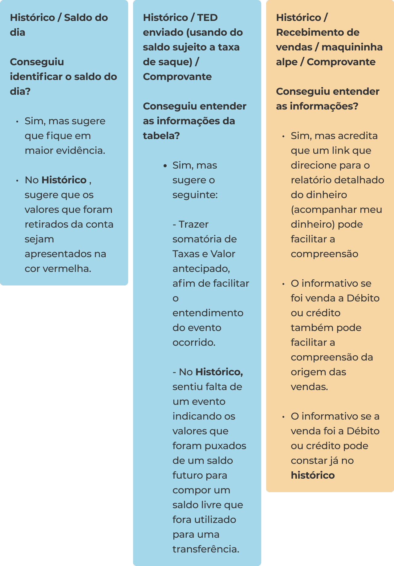 Não, e sugere o seguinte: • Valor da “taxa de saque” e valores de taxas apresentados na tabela de saldos, podem estar com a mesma cor, afim de propor “conexão”. • Concorda com a presença da somatória de Taxas e Valor antecipado, afim de facilitar o entendimento do evento ocorrido.