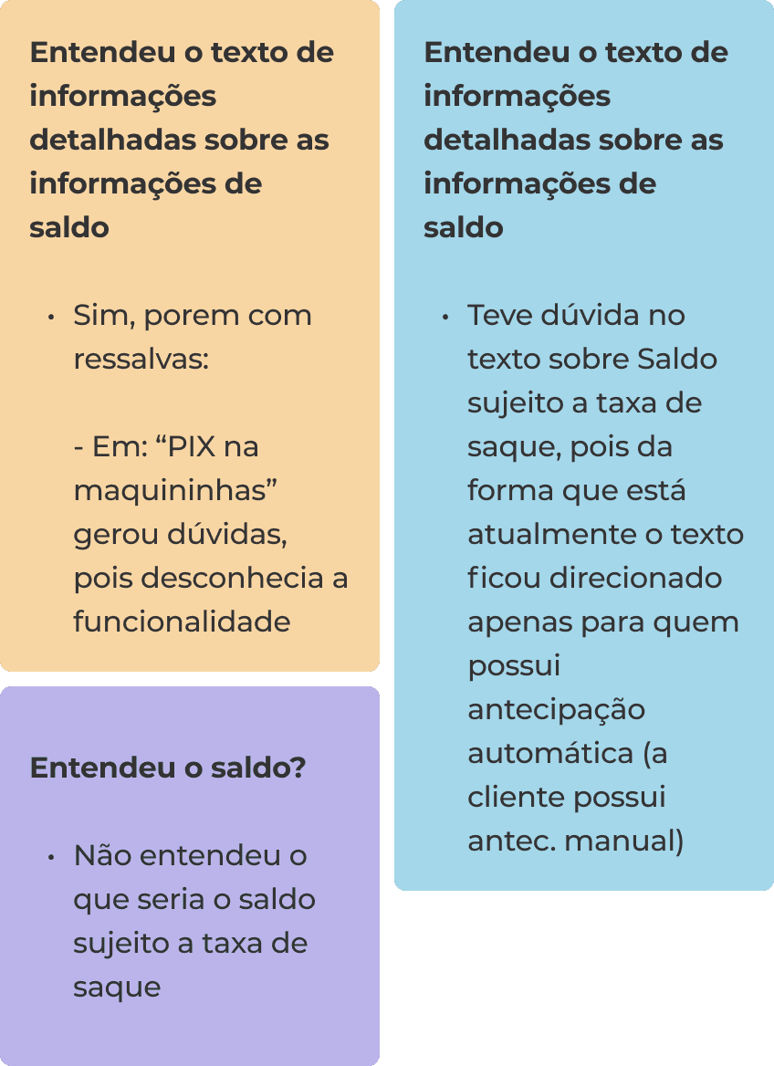 • Teve dúvida no texto sobre Saldo sujeito a taxa de saque, pois da forma que está atualmente o texto ficou direcionado apenas para quem possui antecipação automática (a cliente possui antec. manual)