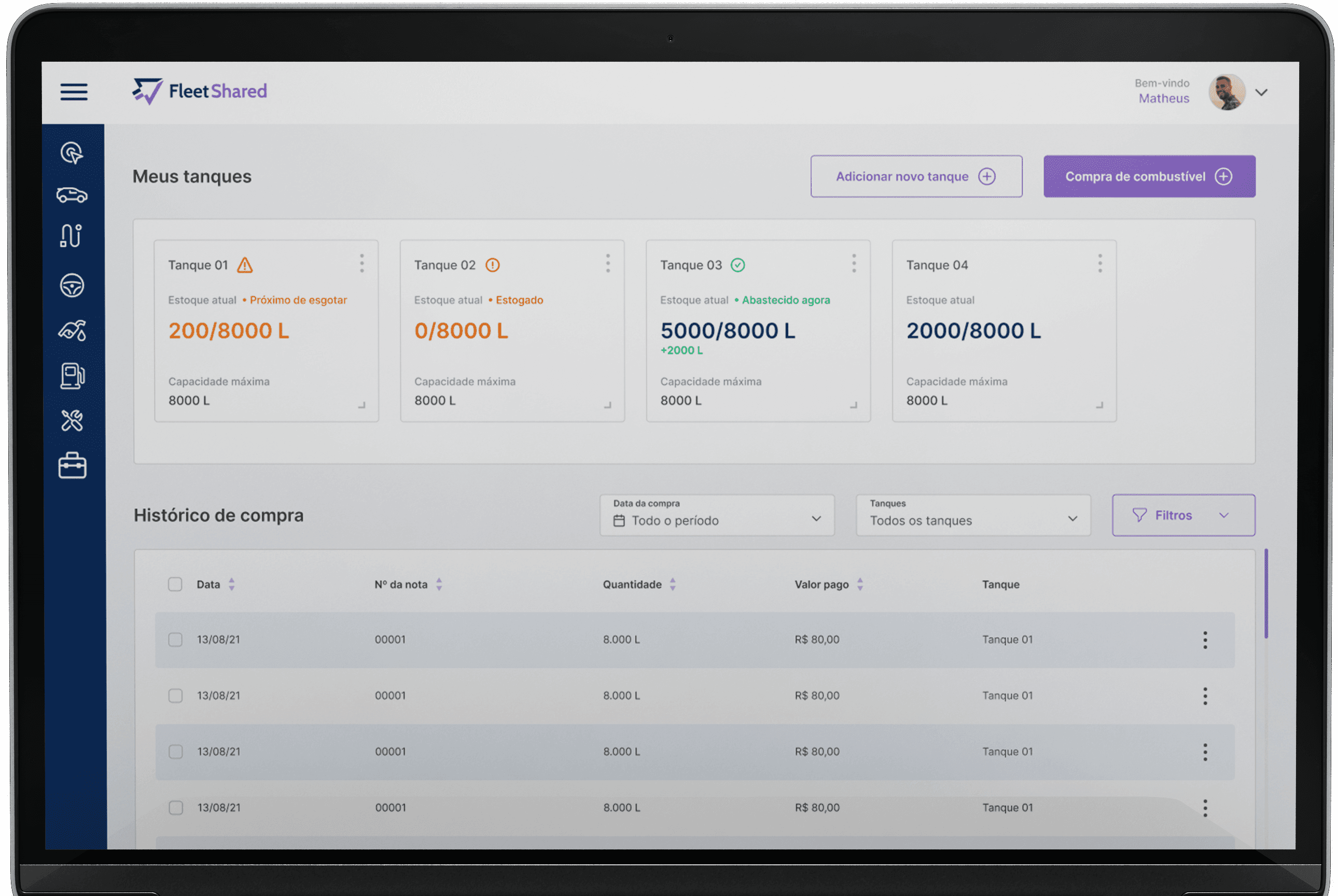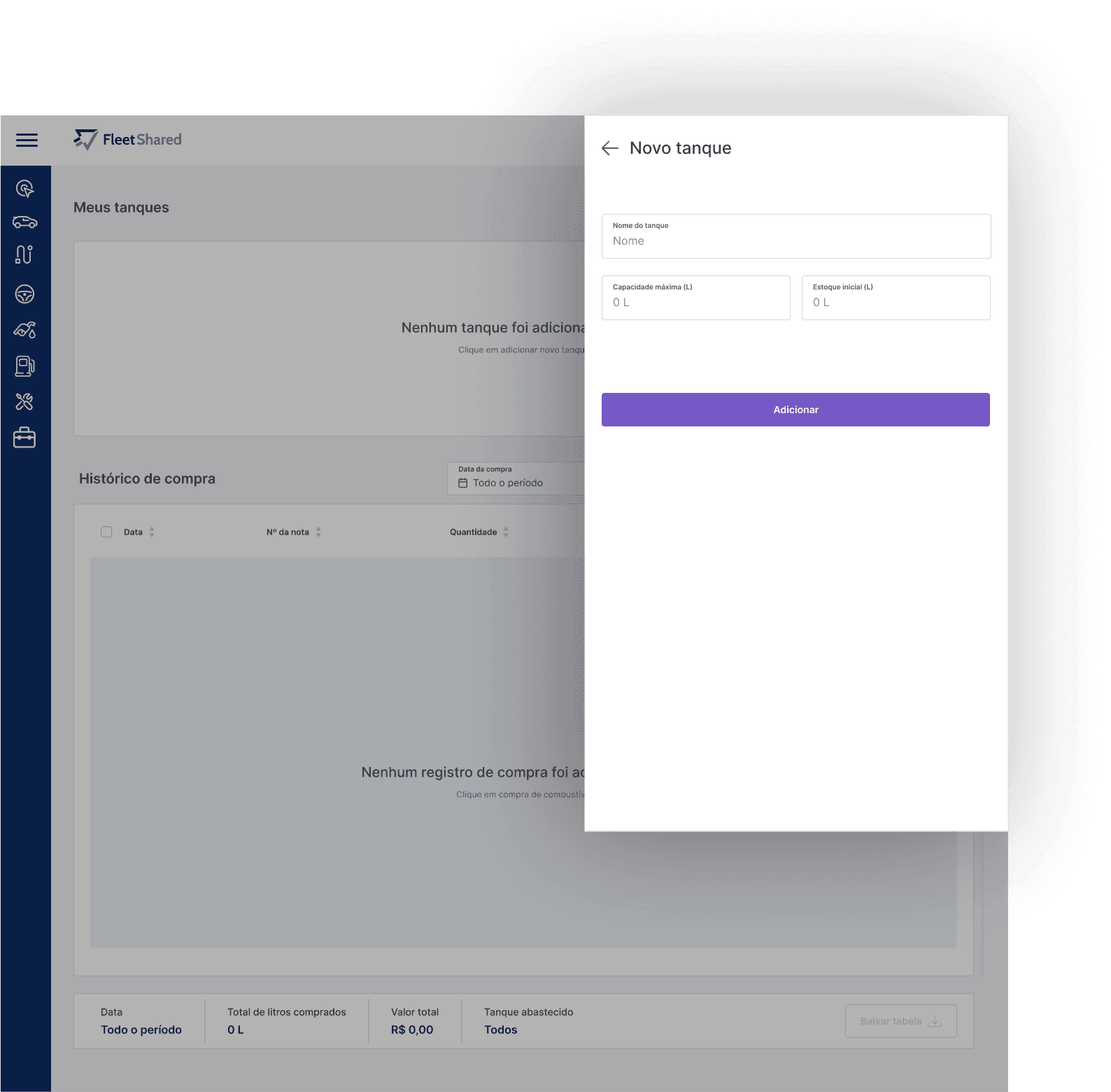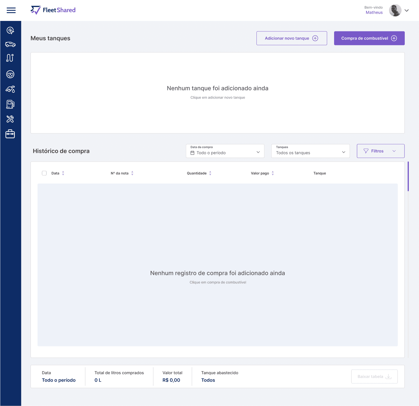 Foi informado que o menu Compras está associado ao menu Tanques, no qual o motorista lança as informações relacionadas as compras de litros para determinado tanque. Porém, se nota que não há um controle específico para qual tanque pertence uma determinada compra de litros, logo, se o motorista exportar uma planilha com esses registros, o mesmo não terá de forma visível, qual foi o tanque mais abastecido.