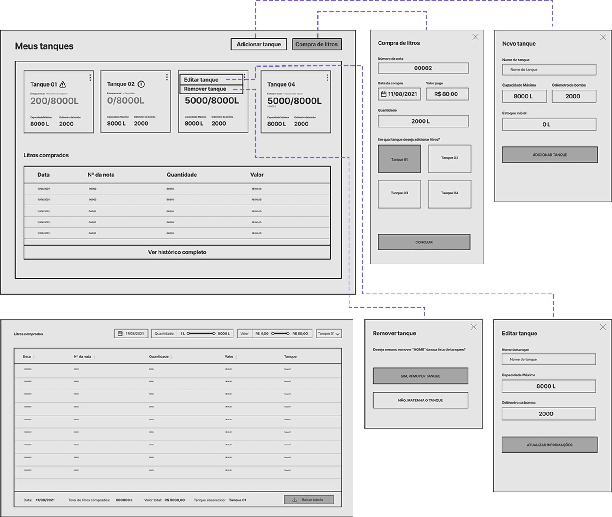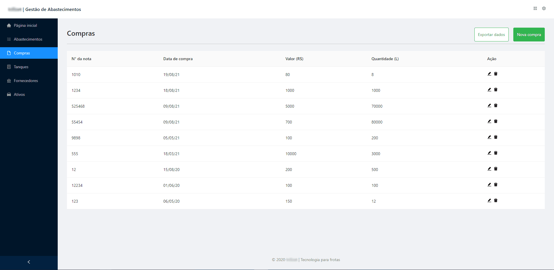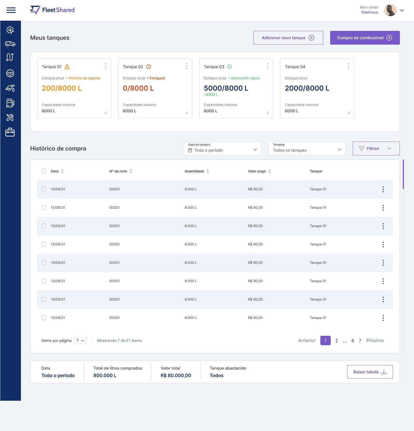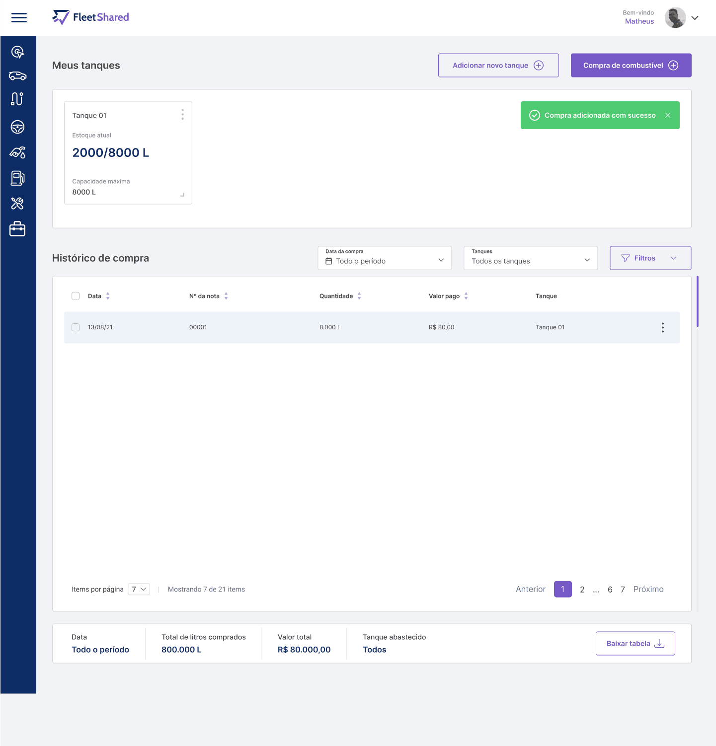 Foi informado que o menu Compras está associado ao menu Tanques, no qual o motorista lança as informações relacionadas as compras de litros para determinado tanque. Porém, se nota que não há um controle específico para qual tanque pertence uma determinada compra de litros, logo, se o motorista exportar uma planilha com esses registros, o mesmo não terá de forma visível, qual foi o tanque mais abastecido.